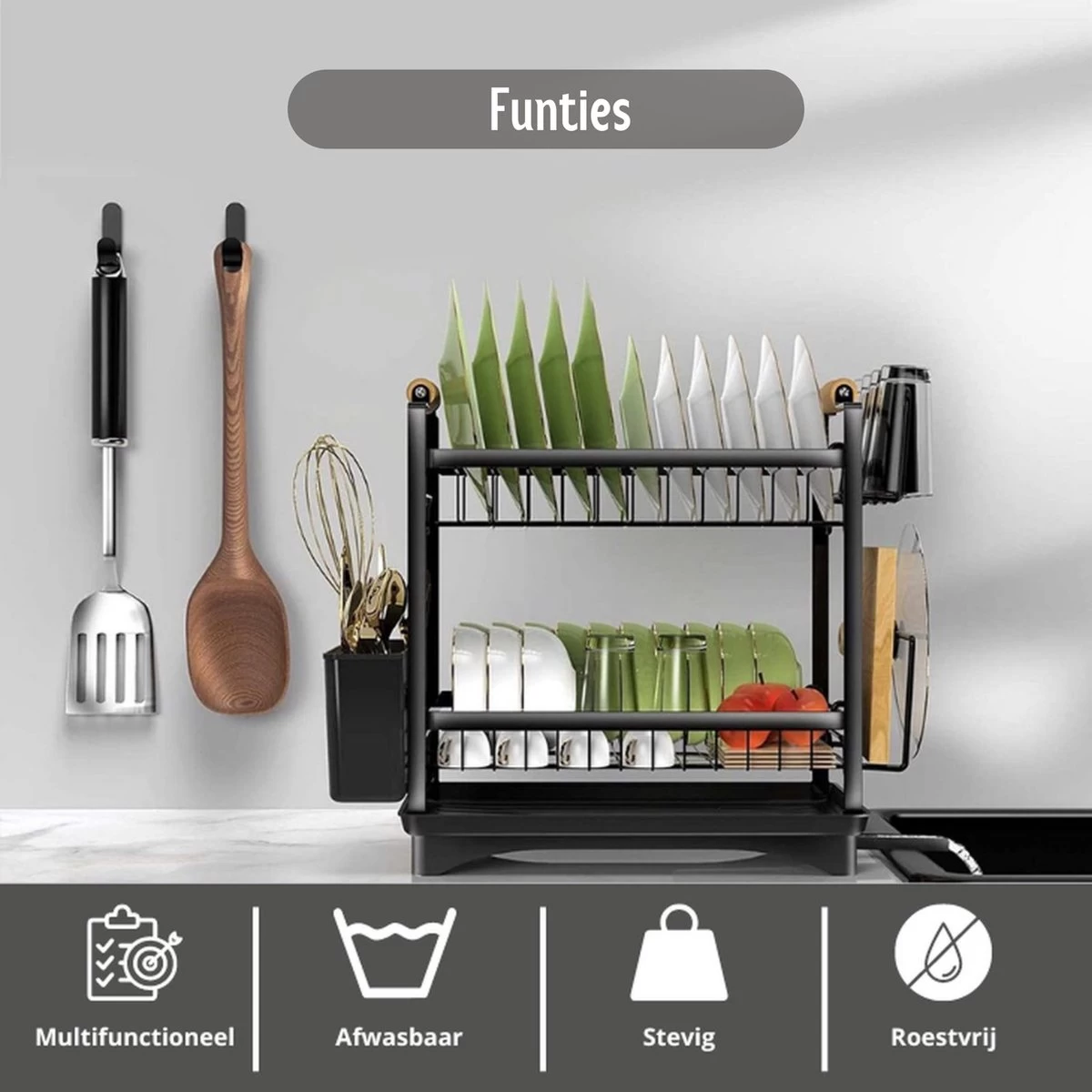 Dit afdruiprek maakt afwassen een stuk aangenamer en is een complete set voor alle soorten servies, pannen en bestek. Het ontwerp is gemaakt van roestvrij staal (RVS) en is voorzien van een bestekbak, houten handvaten en een bordenrek. Het is zelfs geschikt voor grote of hoge glazen en mokken.