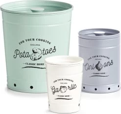 Een set met 3 emmers/blikken om uw knoflook, uien en aardappels in te bewaren/op te slaan, met o.a. de tekst: Garlic, onions en potatoes. Een emmer heeft kleine gaatjes aan de onderkant zodat er geen vocht/geur/schimmel in de emmer en op de inhoud komt. Incl. deksel met knophandvat.