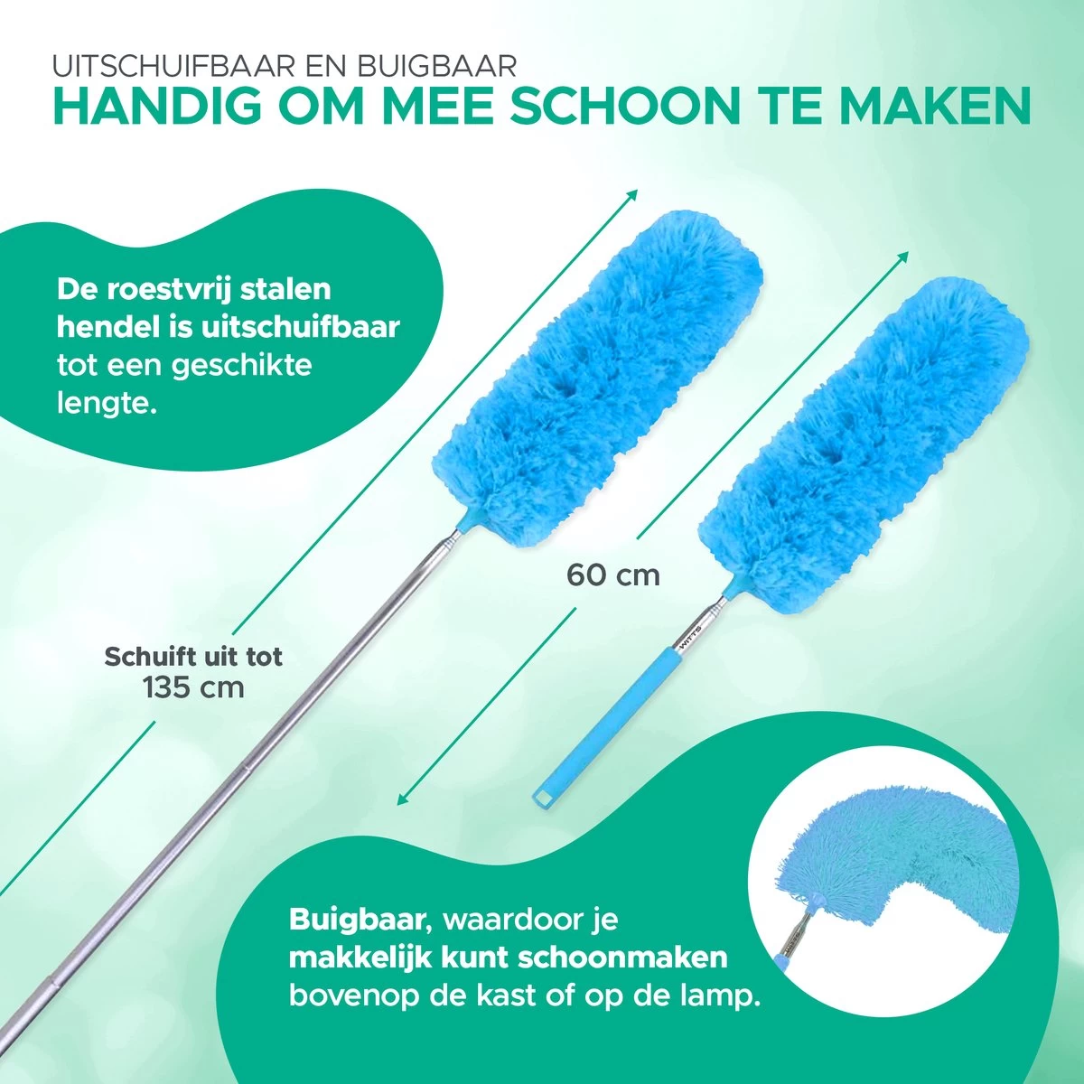De plumeau is gemaakt van superfijne microvezels die al het stof binnen no-time laten verdwijnen. De stofdoek is uitwasbaar en kan eenvoudig worden gereinigd middels een simpele handwas. De microvezel stof is herbruikbaar en u hoeft dus niet steeds nieuwe doeken te kopen, dat bespaart u een hoop geld en gedoe.